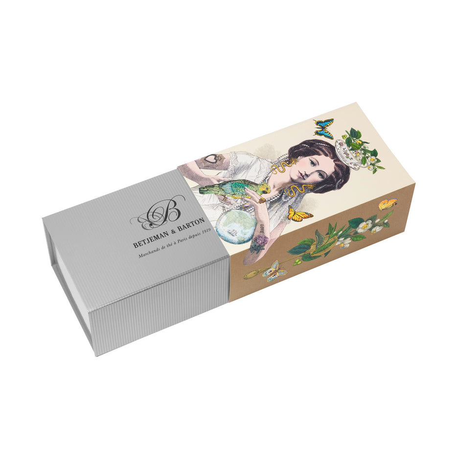 Beautiful surprise box with 29 gifts. What's more wonderful than a surprise? A real surprise box, for the person who will receive this beautiful attention but also for the person who offers it. Discover, open, have your eyes full of stars. Happiness in a surprise box. This year we wanted to impress, spoil and introduce our customers to the Betjeman and Barton world in a different way. To enhance this magnificent box, we have chosen special packaging: A leporello poster version to keep and unfold to make a painting... Beautiful things always keep. This engraving which evokes the tea route with its camellia sinensis, a certain exoticism, a modern bohemian globe trotter who travels the world to amaze us with her finds from the most beautiful tea gardens. A globe-mini cabinet of curiosities which contains so many memories, scents….