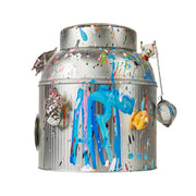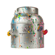 La surface devient alors explosion chromatique. Éclaboussures de peinture, coulures assumées, textures libres composent une œuvre urbaine vivante. Les boules à thé incrustées agissent comme des clins d’œil malicieux à l’univers de la dégustation. Posée dans un intérieur, elle attire le regard comme une pièce de galerie, à la croisée du street art et de l’objet fonctionnel.
