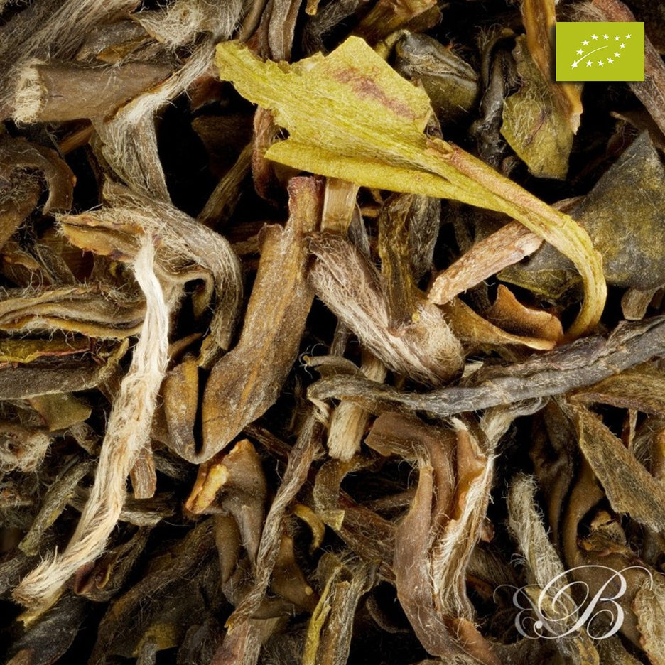Aspect des feuilles séchées : Longues feuilles élancées et délicatement torsadées, d'un vert jade lumineux, généreusement recouvertes d'un fin duvet argenté. Cet aspect cotonneux, confère aux feuilles séchées une texture soyeuse et un éclat blanc nacré caractéristique. L'ensemble compose un thé visuellement magnifique, où chaque feuille semble enroulée sur elle-même.
