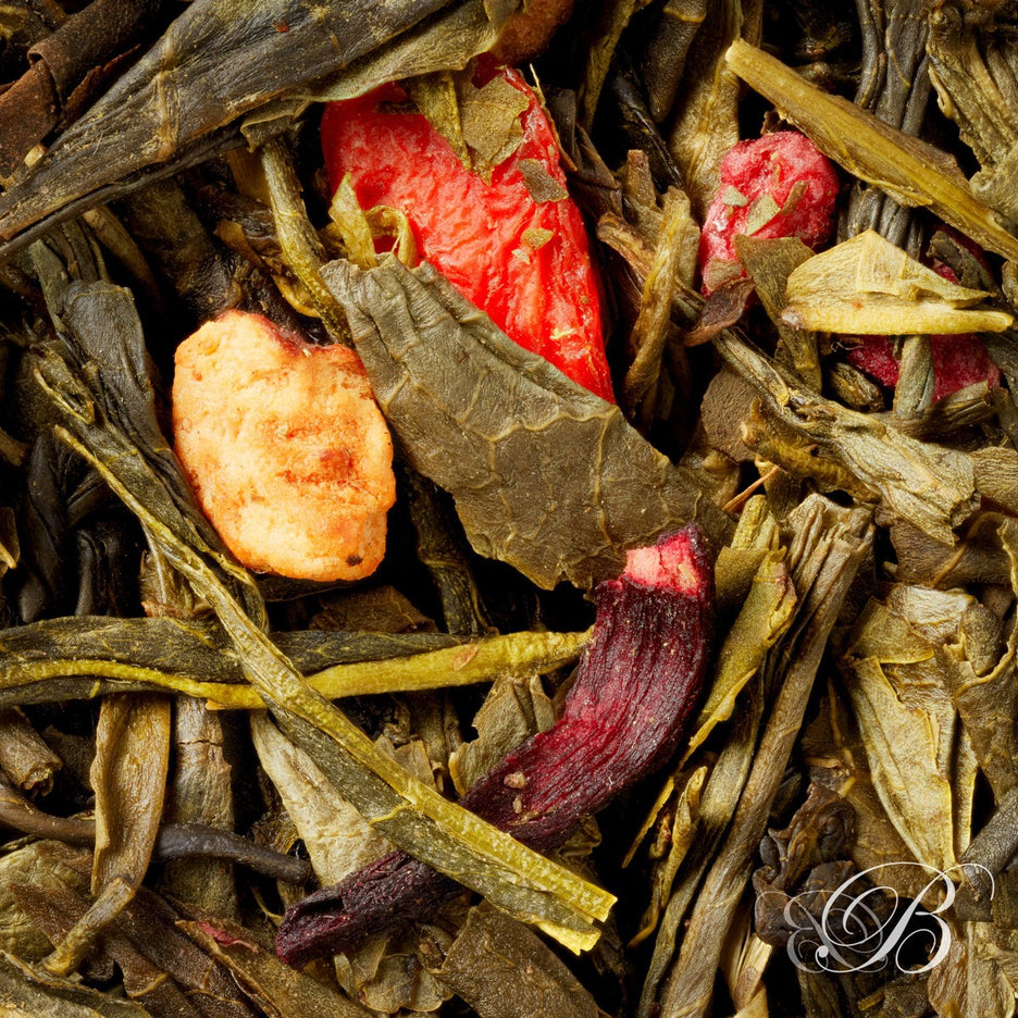 Ce thé est un hommage vibrant à la naturalité et à la vitalité. Composé d’un Sencha de Chine, thé vert reconnu pour sa finesse et sa fraîcheur végétale, il est enrichi de baies de goji et de baies d’açaï, deux superfruits venus des extrémités du monde. Le Sencha, avec sa texture fluide et ses notes herbacées, offre un écrin délicat à ces fruits aux arômes francs et légèrement acidulés.