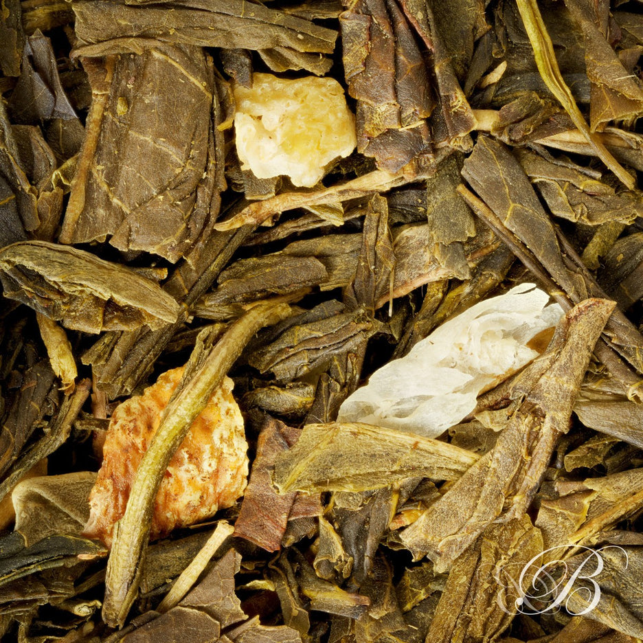 Pouchkine Vert s’appuie sur un thé vert Sencha de Chine, choisi pour sa robe claire, ses feuilles souples et sa douceur végétale. Cultivé à l’abri des vents, sous un climat tempéré, ce Sencha dévoile une texture fluide et soyeuse, une trame délicate où les notes fraîches et zestées peuvent se poser avec justesse. Il offre une base subtile, presque translucide, idéale pour accueillir les agrumes nobles dans une partition vive et élégante.